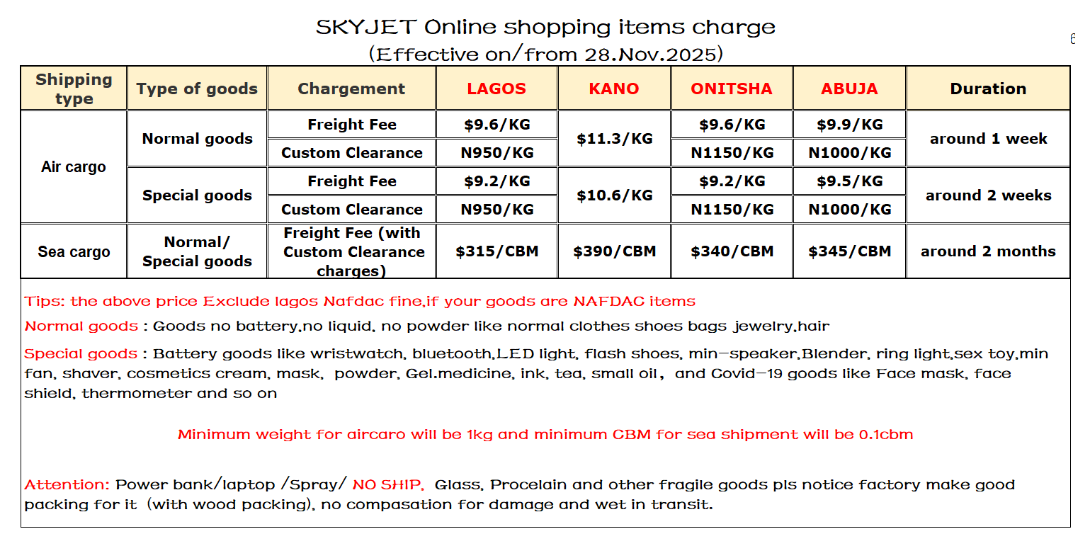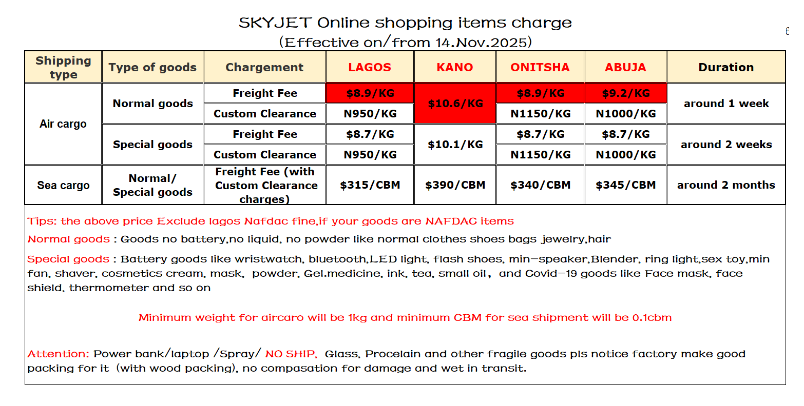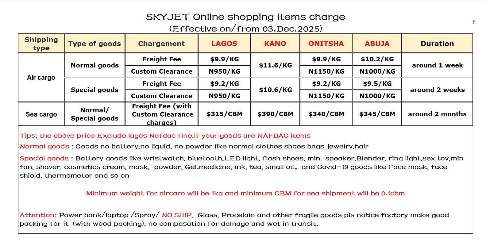 Due to the outburst of online goods exportation to European countries and USA sides in Xmas season, airliners have transfered most of the flights to those coutries and remain few flights to other countries, which caused competition of high prices cand insufficient flight spaces to Nigeria market. Pls find the new updated price sheet as below, any shipment send from today will use the new price !!
