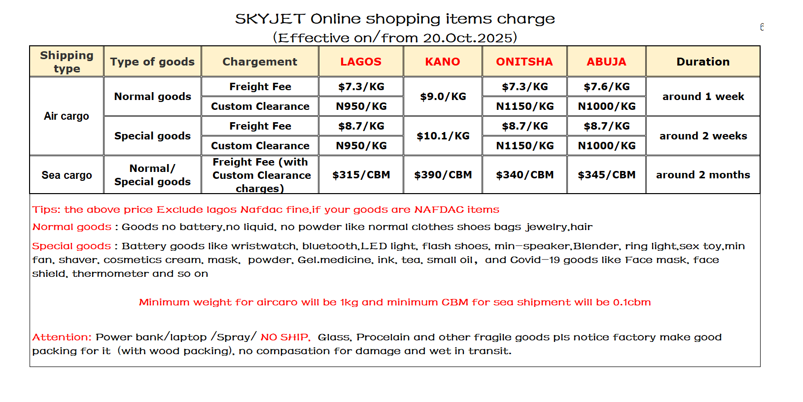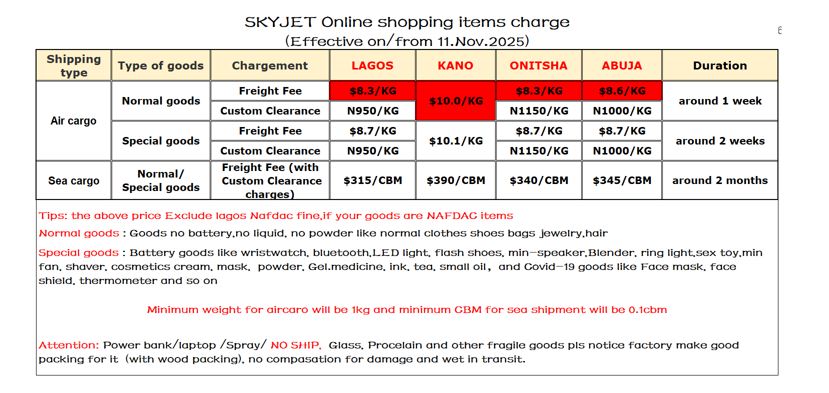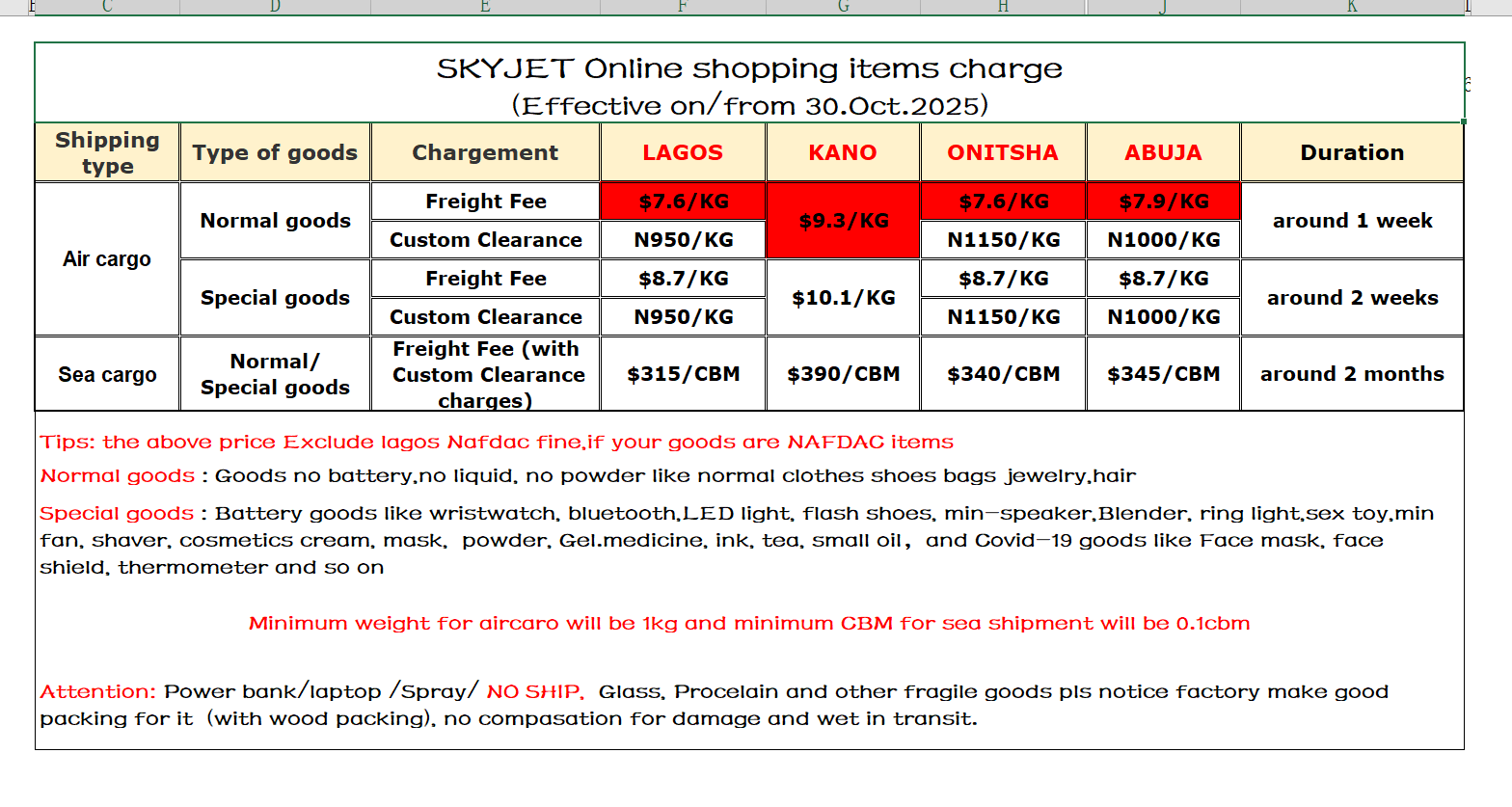 Due to the outburst of online goods exportation to European countries and USA sides in Xmas season, airliners have transfered most of the flights to those coutries and remain few flights to other countries, which caused competition of high prices cand insufficient flight spaces to Nigeria market. Pls find the new updated price sheet as below, any shipment send from today will use the new price !!